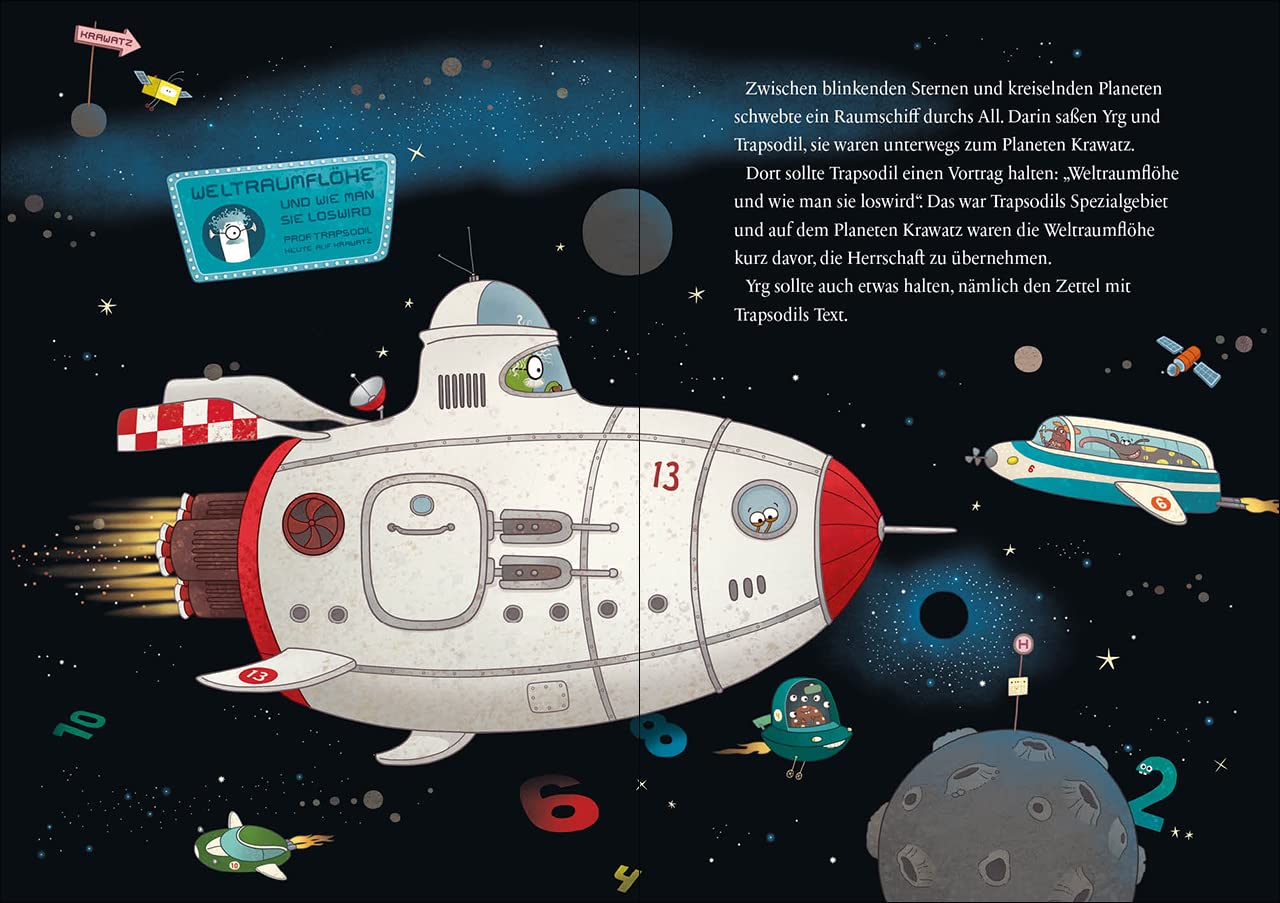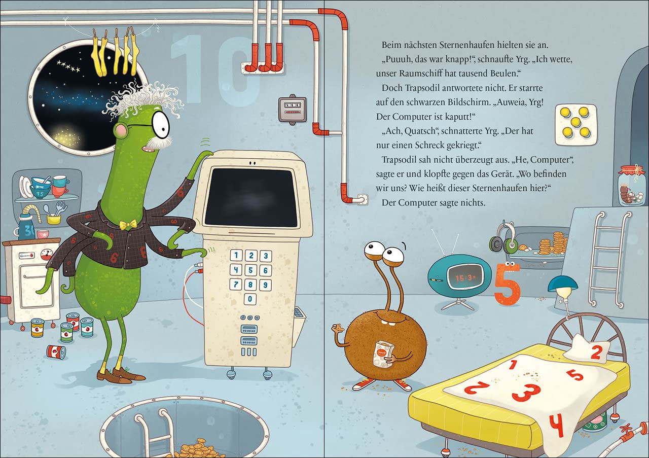 Doch der bleibt stumm. Und Yrg hat das Handbuch vergessen, in dem der geheime Zahlencode steht, mit dem sich der Computer selbst reparieren kann. Wie sollen denn Trapsodil und Yrg nur den Weg zum Planeten Krawatz finden? Da erscheinen plötzlich flackernde Worte auf dem Bildschirm. Mit letzter Energie gibt der Computer Zahlenrätsel auf, damit Trapsodil und Yrg an den Zahlencode gelanden, um ihren Weg fortsetzen zu können…