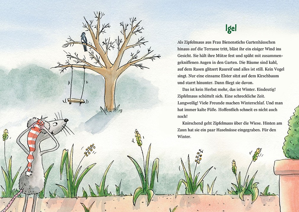 Der Winter ist da. Als Zipfelmaus aus Frau Bienenstichs Gartenhäuschen hinaus auf die Terrasse tritt, kann sie ihn überall spüren. Selbst Dickespinne hat sich schon in einen warmen Schal eingemummelt. Zipfelmaus ist ganz begeistert. Dickespinne verspricht ihr einen zu Weihnachten. Weihnachten? Was mag das sein? Vor sich hinträumend trifft sie auf Igel. Der macht ja noch gar keinen Winterschlaf. Na dann kann sie ihn ja fragen, ob er weiß, was Weihnachten ist. Weihnachten, ist etwas Wunderschönes, erklärt Igel.