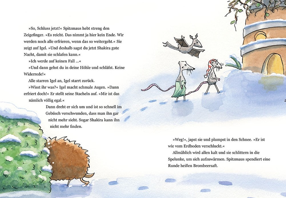 Einmal während des Winterschlafes ist er aufgewacht. Überall gab es Lichter. Und einen Baum mit leuchtendem Schmuck. Die Menschen überreichten sich kleine Pakete. Und der Himmel hing voller Sterne. Glücklich ist Igel wieder eingeschlafen. Am nächsten Morgen treffen sich die beiden wieder. Mittlerweile hat es geschneit. Aber Igel hält immer noch keinen Winterschlaf, und er ist ganz eigenartig drauf. Ihm ist alles egal. Von Dickespinne erfährt Zipfelmaus, dass ihm ein Ast auf den Kopf gefallen ist und er sein Gedächtnis verloren hat. Was nun? Wenn Igel den ganzen Winter draußen herumläuft, wird er krank oder erfriert. Ob ihn vielleicht Weihnachten glücklich in den Schlaf sinken lässt?